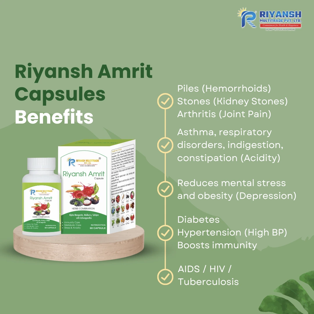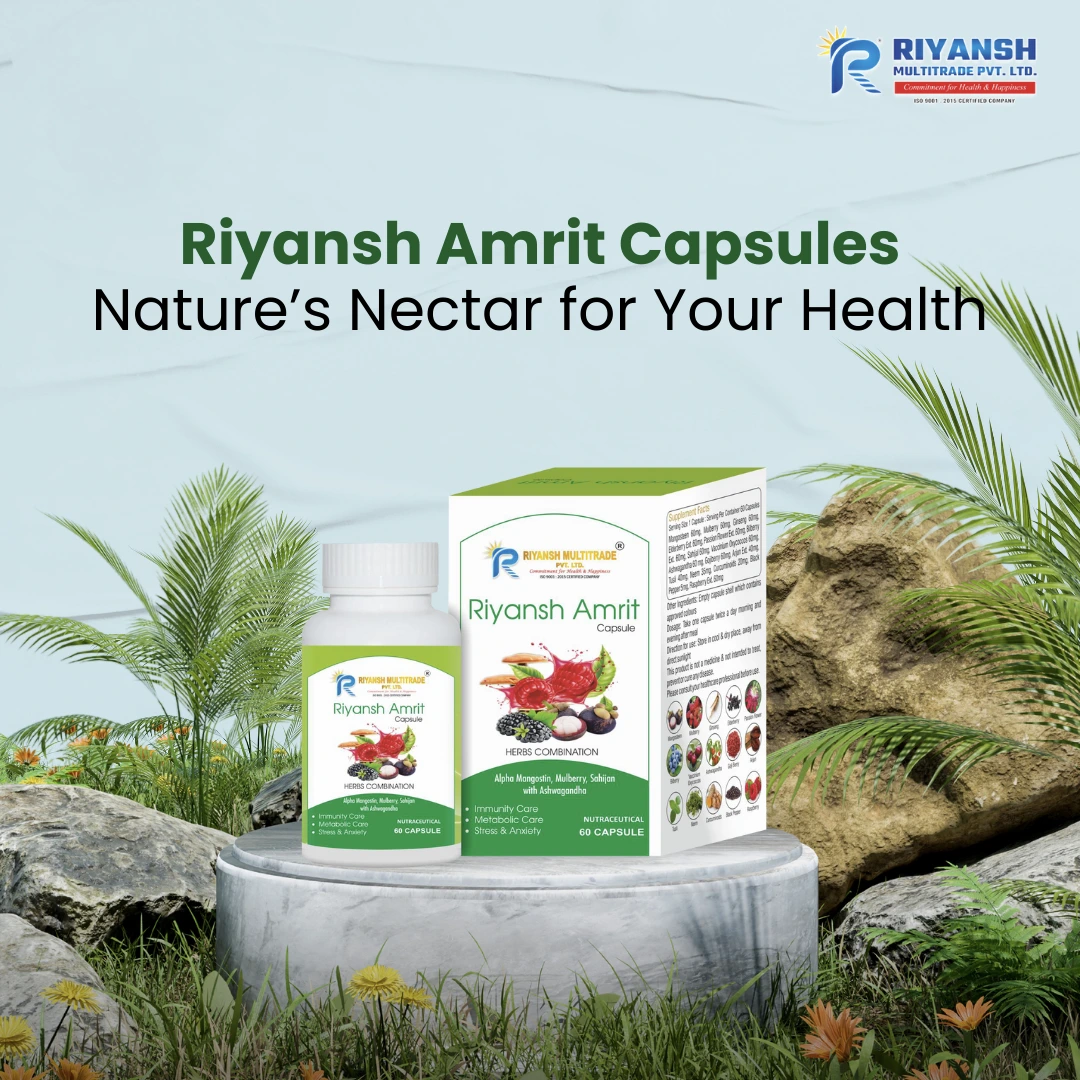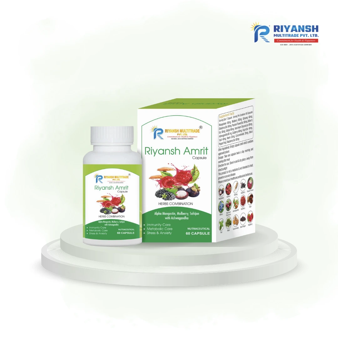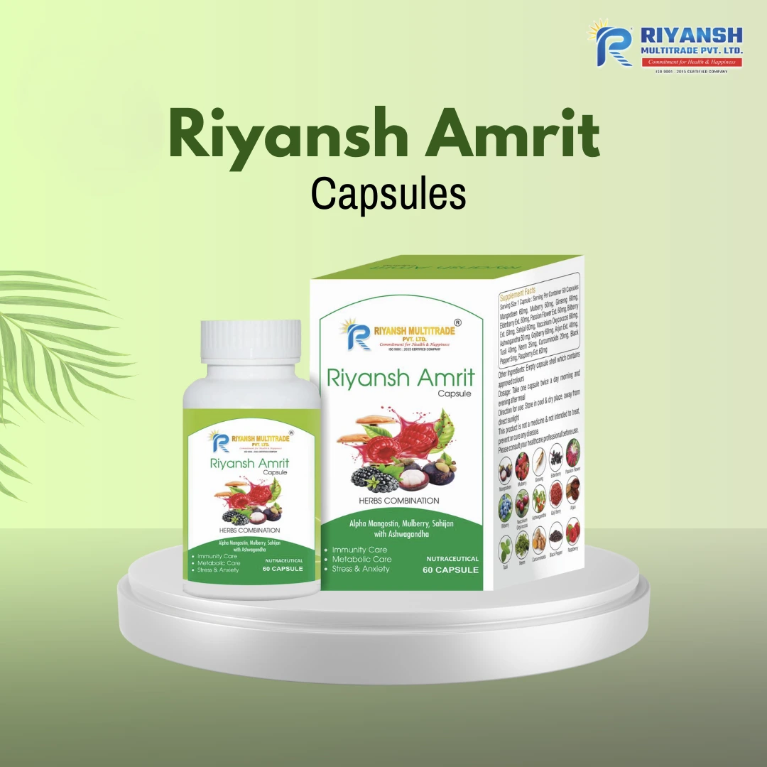 Riyansh Amrit Capsules from Riyansh Multitrade Pvt. Ltd. is a premium herbal formulation made with Alpha Mangostin, Mulberry, Salai, Ashwagandha, and other natural botanicals. > It is designed to complement a healthy lifestyle by supporting daily vitality and overall well-being. Ideal for individuals looking for a trusted, Ayurvedic-based supplement to help maintain a balanced and active lifestyle.